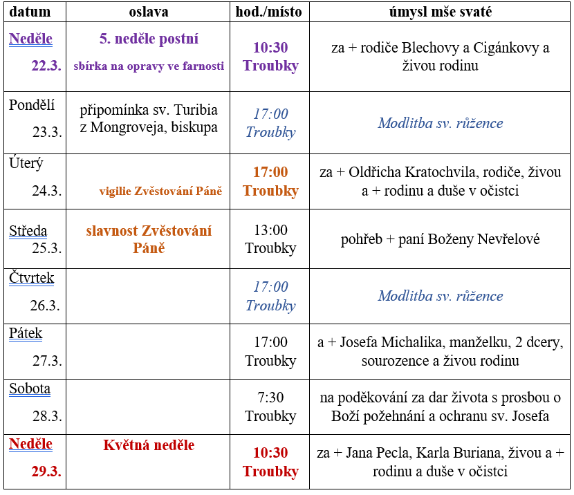• Příští neděli bude od 16:00 hod. možnost předvelikonoční svátosti smíření. Budou ještě zpovídat dva další kněží. Prosím o pomoc při zajištění pohoštění na faře pro zpovídající kněze po sv. smíření.
